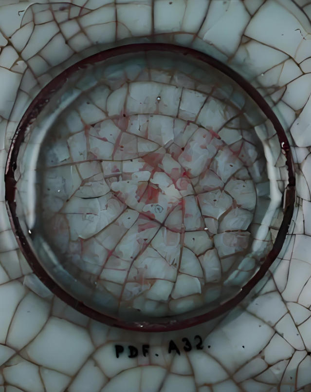 高5厘米,口径19.5厘米,盘呈六瓣葵花式,浅腹檀底,通体是半透明的灰蓝色釉,釉面还开有细碎裂纹。口沿镶嵌着铜扣,圈足鹿胎处呈棕褐色,底部还刻有乾隆玉蹄狮铁足兵文火器捐