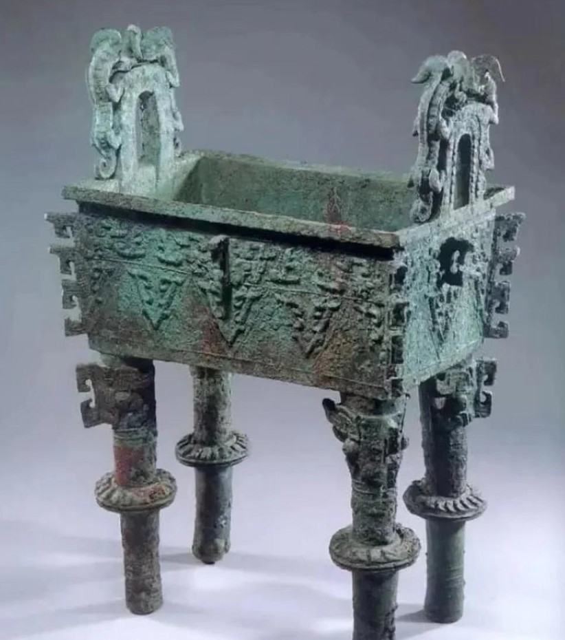 典型西周鼎(如洞山大鼎)高约60厘米,敛口折沿,方唇立耳,深弧腹圜底,三柱足中空。腹部饰六组饕餮纹,以扉棱间隔,足上部浮雕兽面纹,纹饰层叠繁复,绿锈斑驳间可见云雷纹底。腹内壁铸族徽铭文,彰显贵族身份