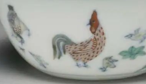 整器仿照成化时期的风格,绘画笔触细腻生动,色彩绚丽无比。它巧妙地运用了釉下青花与釉上的鲜红、叶绿、水绿、鹅黄、姜黄及黑彩等多种色彩,结合填彩、覆彩、染彩和点彩等多种技艺,以青花勾勒并平染洞石,用鲜红覆盖花朵,水绿覆盖叶片,鹅黄和姜黄填充小鸡,再以红彩点缀鸡冠和羽翅。在色彩的浓淡之间施以巧思,既保持了素雅之风,又不失鲜丽之色,每一处都生动传神。
