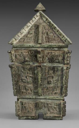 商代“亚若”方彝是晚期青铜礼器,通高约30厘米,呈长方形盖顶式样,盖钮作四面坡屋顶形,器身直腹圈足,四隅及中线设棱脊。主体饰三层花兽面纹,盖面与器腹辅以夔龙纹、云雷纹填地,圈足饰蝉纹。器内壁铸“亚若”二字铭文,表明其为商代“亚”族祭祀礼器,象征持有者“若”的宗族身份与宗教职能。方彝作为盛酒器,其封闭式设计利于保存鬯酒,繁缛纹饰与棱脊分割凸显商晚期青铜铸造的巅峰技艺,属典型“重酒文化”器物