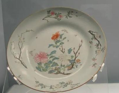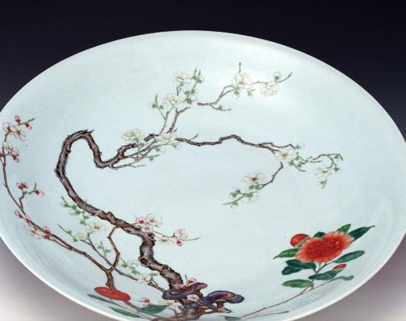 敞口,圈足,器身内外及底均施白釉,釉色细白洁净,盘内所绘梅花树,枝干苍虬,梅花分红白两色,绘制细腻。粉彩创烧于康熙朝晚期,雍正时期是烧制高峰期,乾隆时期以后虽大量烧制,但以雍正时期烧制最精,粉彩是在五彩基础上发展而来,不同的是粉彩在色料中加入了铅粉,烧成后柔和艳丽。此盘绘画精细,色调柔美。