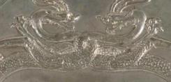 此镜制作于8世纪中叶唐玄宗时期,原属圣武天皇(701-756年)私人珍藏。镜背盘龙造型延续战国错金银龙镜的蛇形传统(如洛阳金村战国墓六龙镜),但兽形特征更显著,四爪造型与西安何家村出土鎏金银器龙纹同源,印证盛唐龙图腾的形态转型。756年由光明皇后献纳东大寺,录入《东大寺献物帐》,成为佛教仪式中象征皇权的供器。其纹饰融合波斯萨珊王朝金银器元素(如卷云纹布局),而龙吞珠母题则源于道教文化,反映唐代丝路多元文化交融。日本《续日本纪》记载此类铜镜为遣唐使携归的"唐式镜",直接推动奈良时代贵族用镜风尚