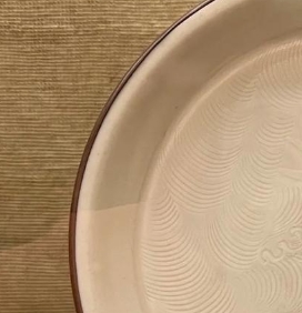 定窑印花盘为敞口,浅腹,圈足。器型大而规整,线条流畅,比例协调,体现了宋代瓷器造型的简约之美。胎体轻薄,胎色洁白,质地坚硬细腻,经过精细的淘洗和炼制,很少有杂质和气孔。以白釉为主,釉面细润光滑,釉色白中微微闪黄,如象牙般温润,在造型曲线转折变化的积釉处,常呈现较明显的青白色,且釉水垂流会形成独特的 “泪痕” 现象
