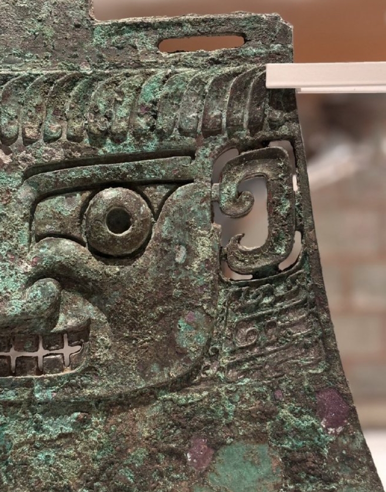 这件青铜钺高30.4厘米,刃部宽35厘米,重量4.8公斤,只比妇好墓王室对鉞级别小,与山东益都苏埠屯对鉞相当。这件纹饰尤其精彩,是少见的人面,连头发都做了刻画,面部肌肉也很立体,浮雕感是商周青铜器里不多见的,审美上与饕餮纹、透空装饰的不同。