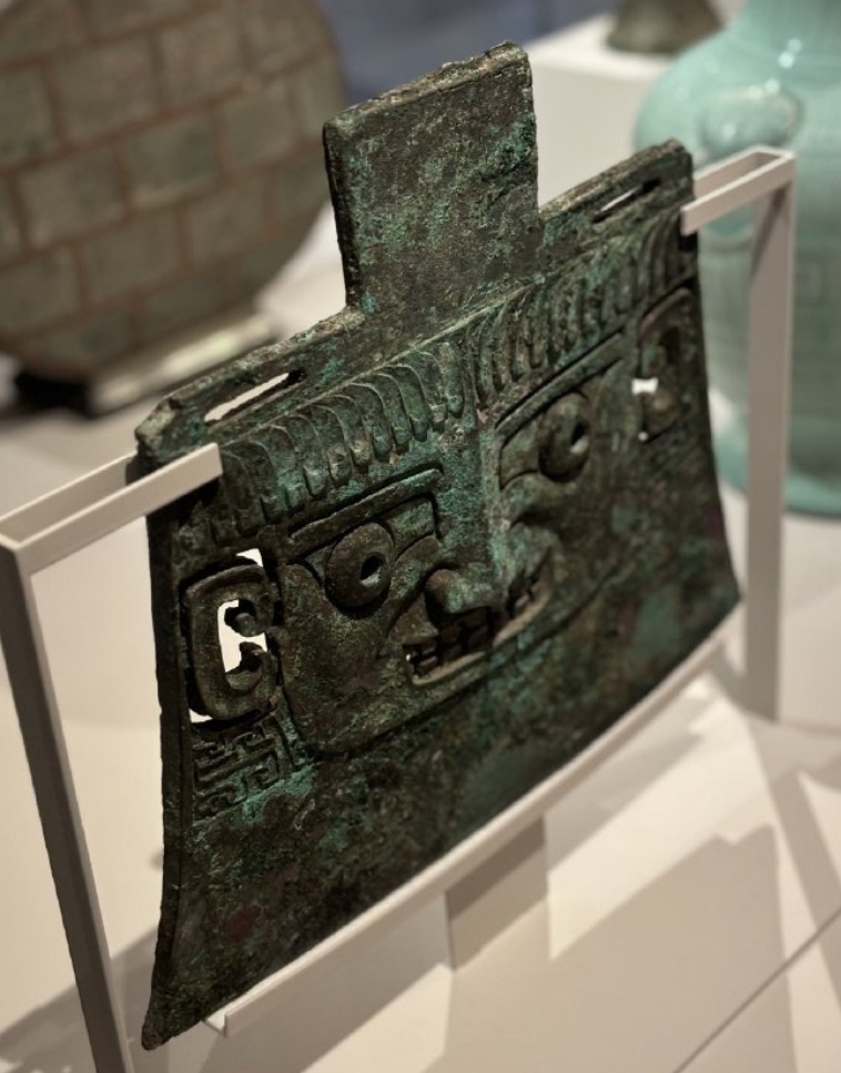商周时期,青铜钺不仅是一种进攻性的武器,更是权力和地位的象征。不同大小和纹饰的青铜钺对应着使用者不同的身份。这件青铜钺上面的人脸纹饰是守护 “薄姑国” 的神灵,象征着神权相授、天人合一。