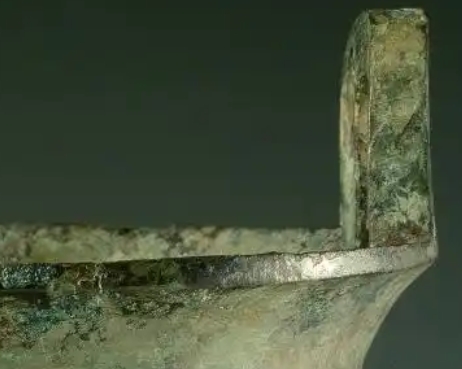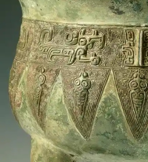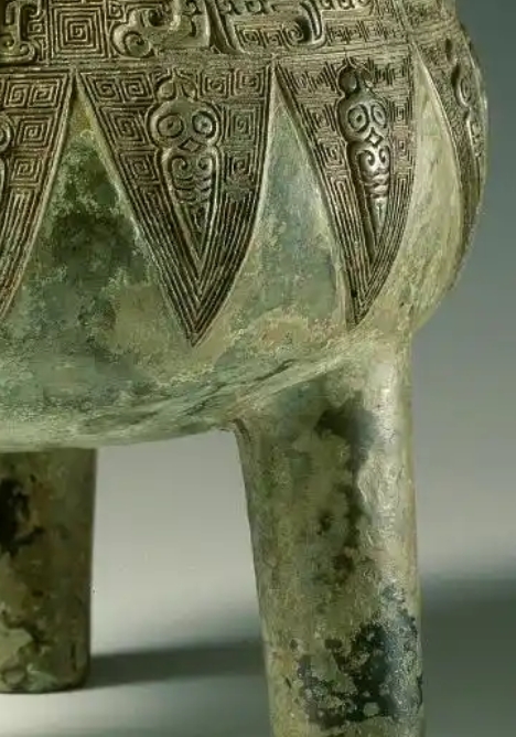 立耳,圆腹外鼓,下接三柱足,这种设计便于搬运和放置加热 。腹部上部分有复杂的兽面纹、云雷纹等纹饰,庄重威严;下部是三角纹装饰,富有层次感 ,体现当时高超的纹饰铸造工艺。青铜材质,表面带有岁月侵蚀的铜锈痕迹,呈现古朴的青绿色,彰显历史厚重感。