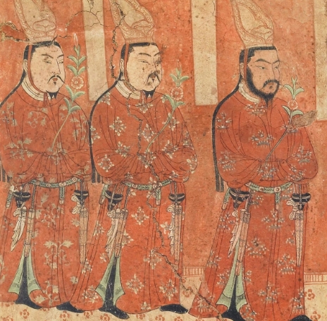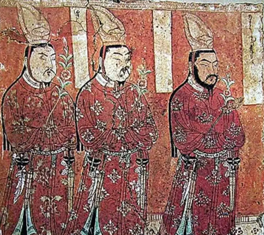 回鹘高昌王身着具有鲜明民族特色的服饰,头戴华丽的尖顶高帽,帽上可能装饰有珠宝、羽毛等彰显身份的物件;身着圆领长袍,袍服面料考究,纹饰精美,腰间束带,上挂蹀躞七事等配饰,展现出高昌王的尊贵身份。此外,脚蹬长筒靴,体现出西域民族的服饰风格。