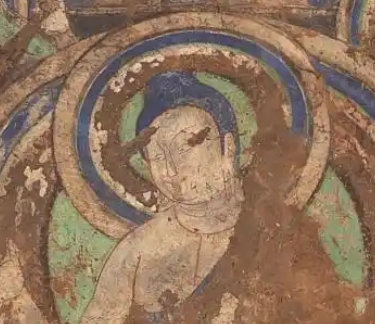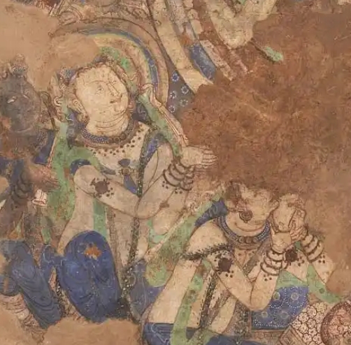 这是克孜尔石窟壁画,展现了佛教题材场景,中央可能是佛陀,周围环绕着菩萨、天人等形象 。壁画运用了龟兹画风,以线条勾勒轮廓,色彩丰富,采用 “凹凸法” 增强立体感。