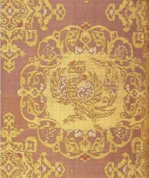 紫地凤形锦御轼为圣武天皇御用扶手靠垫,主体以紫地织锦为面,内部填充植物纤维束与棉花,外层覆麻布后包覆锦缎。织锦纹样以凤凰为核心:昂首展翅的凤凰被葡萄藤与唐草纹环绕,周身以金线勾勒轮廓,羽翼采用"簇四金"技法织出立体鳞状纹理;主纹间隙点缀菱形花草副纹,形成繁而不乱的层次。经比对,其凤凰造型与敦煌莫高窟壁画中的金翅鸟形态相似,而唐草纹的卷曲结构完全符合唐代"陵阳公样"的对称特征。该御轼保存完好,锦缎色泽饱和度高,是现存最完整的唐代帝王日常用具之一