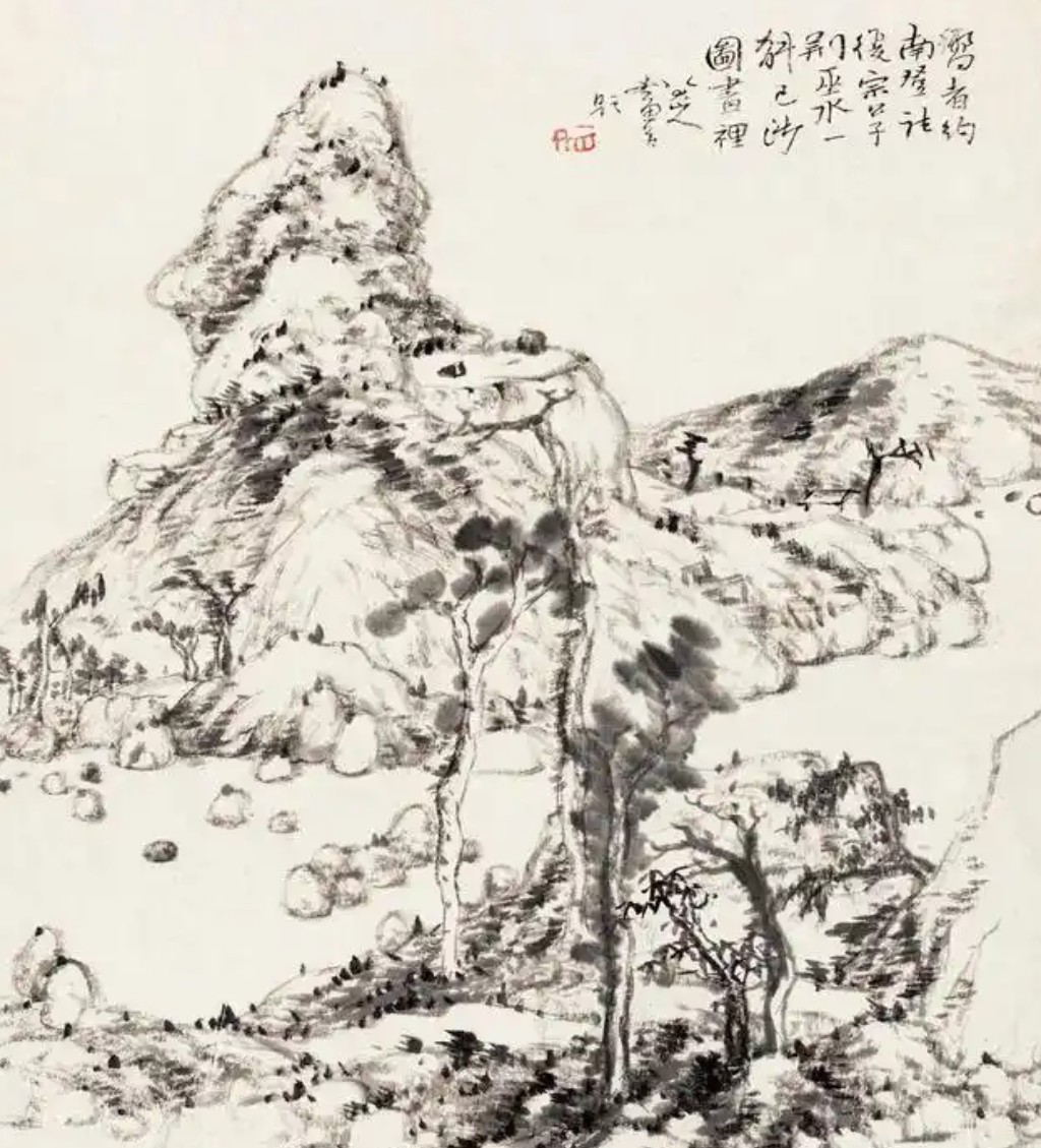 “安晚”两字闲适之极,相当有诗意。所谓“安晚”,即“安度晚年”之意。八大山人借鉴了南朝宗炳卧游的典故。传说宗炳年轻时到处游历,年纪大了之后,不方便再到处游玩,于是把以前所游的山川绘成图画,悬于四壁,营造出一个另一个大自然。