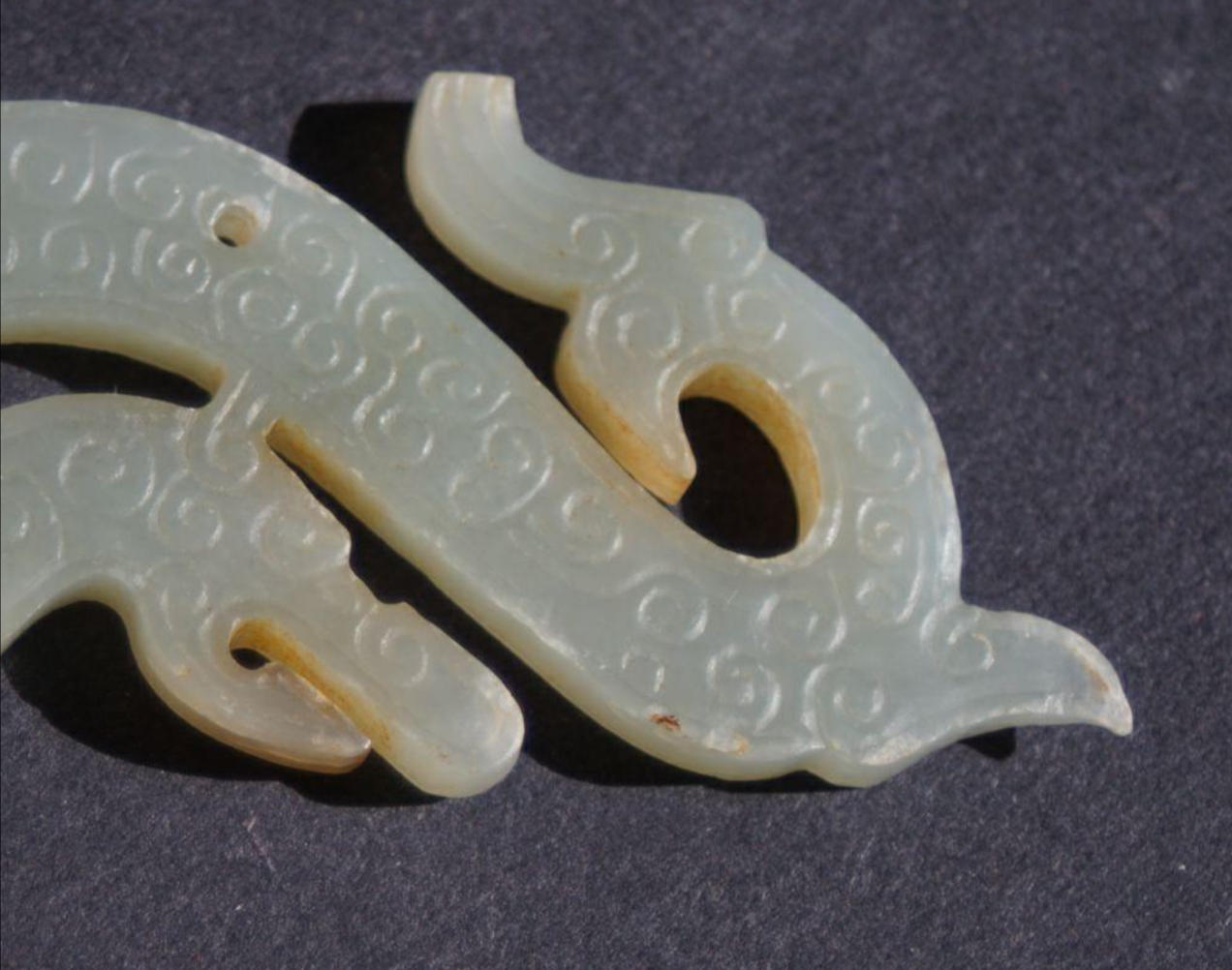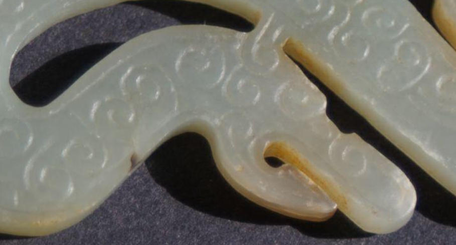 1980年间发掘湖北省枣阳九连墩楚国君王墓,出土大量玉器,其中一件纹饰与此件十分相似,故断战国中时期。此件2014年10月在波士顿地区收集。
