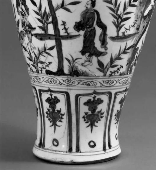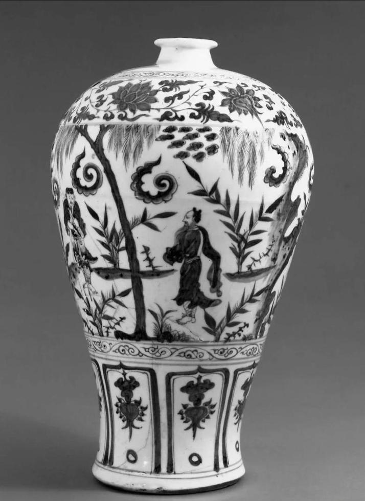 元青花缠枝牡丹纹梅瓶的42.4厘米的高度和优雅造型,彰显了元代瓷器的雄浑豪放。该梅瓶线条流畅,装饰技艺精湛,人物形象栩栩如生,展现了匠人的卓越智慧与精湛技艺。它是元代制瓷工艺巅峰之作的见证,不仅体现了当时的文化氛围与精神气质,还是中西方文化交流的重要载体,承载着丰富的历史与艺术价值。