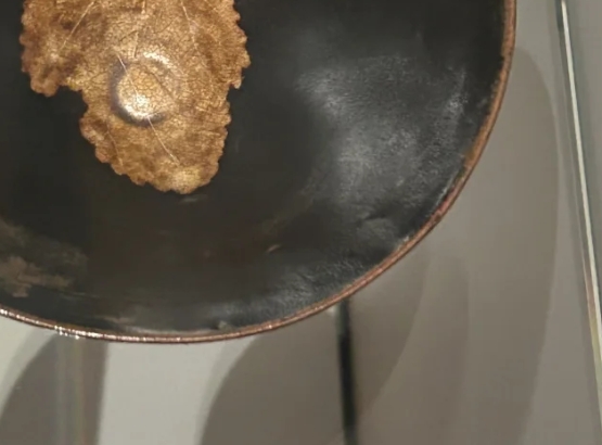 以黑釉为底色,盏内贴有一片完整或部分的木叶,经过高温烧制,木叶的形状和脉络清晰地留在盏内,呈现出独特的艺术效果。这种瓷器在宋代较为流行,是当时文人士大夫阶层喜爱的饮茶器具,体现了宋代独特的审美意趣和茶文化。