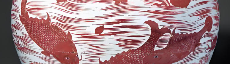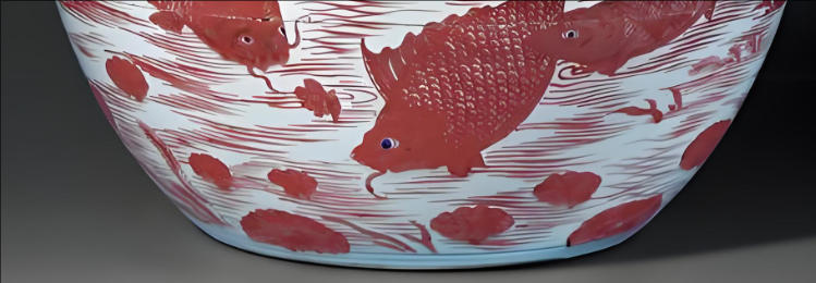 釉里红呈浓红色,通过浓淡不一的色阶和局部留白,细腻地渲染出鱼纹与水藻的层次与动态,展现出极高的工艺水平和艺术价值。此缸不仅体现了康熙时期瓷器制作的精湛技艺,也是当时审美趣味的生动写照。