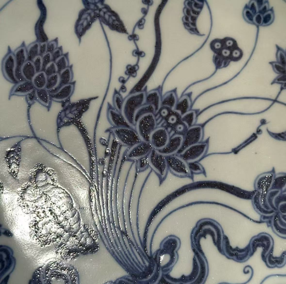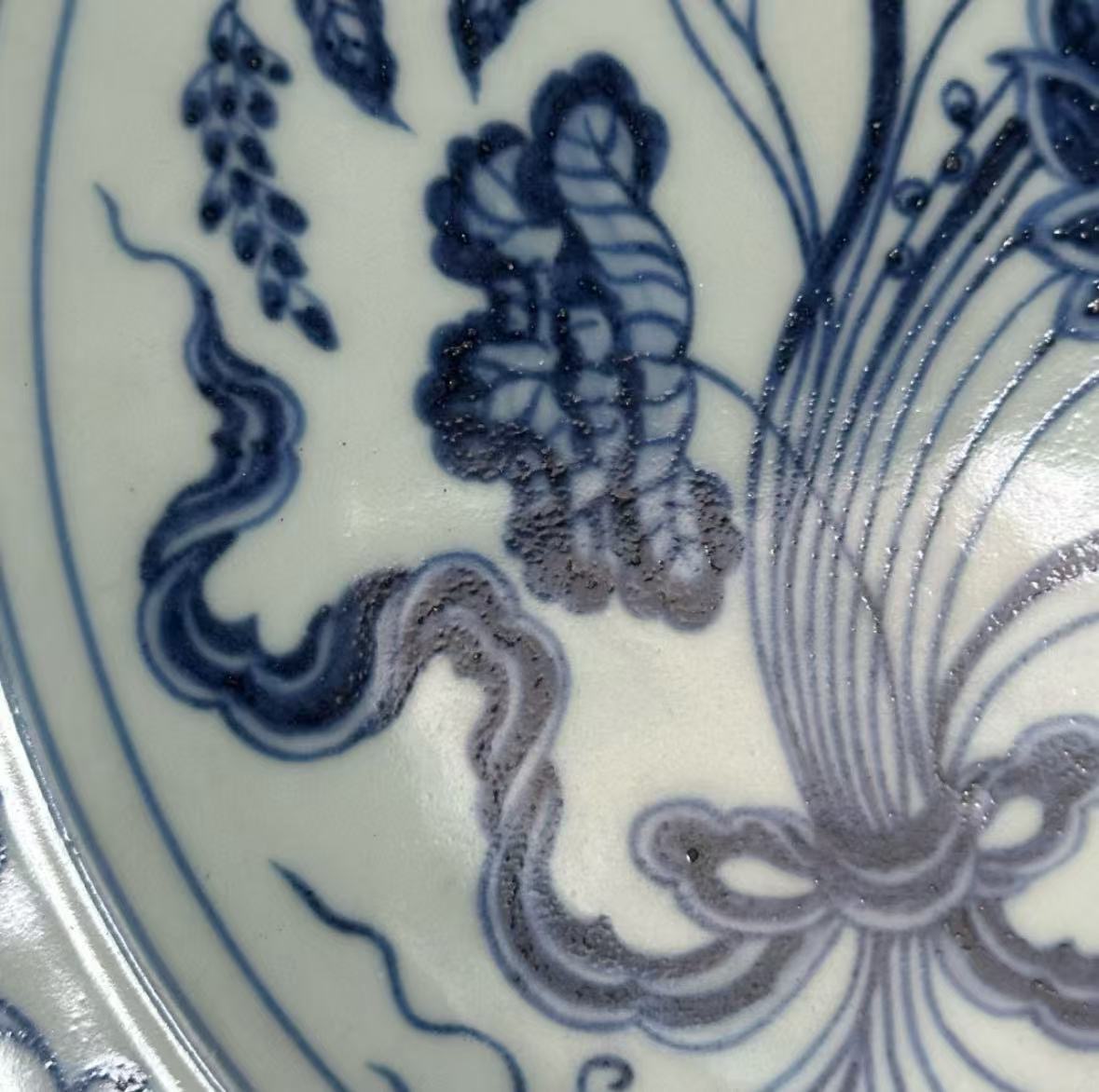 工艺特点:永乐青花以苏麻离青料发色浓艳,晕散自然,盘心绘束莲纹,外壁饰缠枝花卉,直径约35厘米