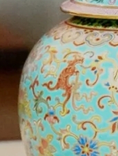 以浅蓝色为底色,罐身和罐盖绘有丰富多样的花卉纹、瑞兽纹等图案,色彩绚丽,有金黄、翠绿、粉红等,纹饰细腻精美,兼具实用与陈设价值。