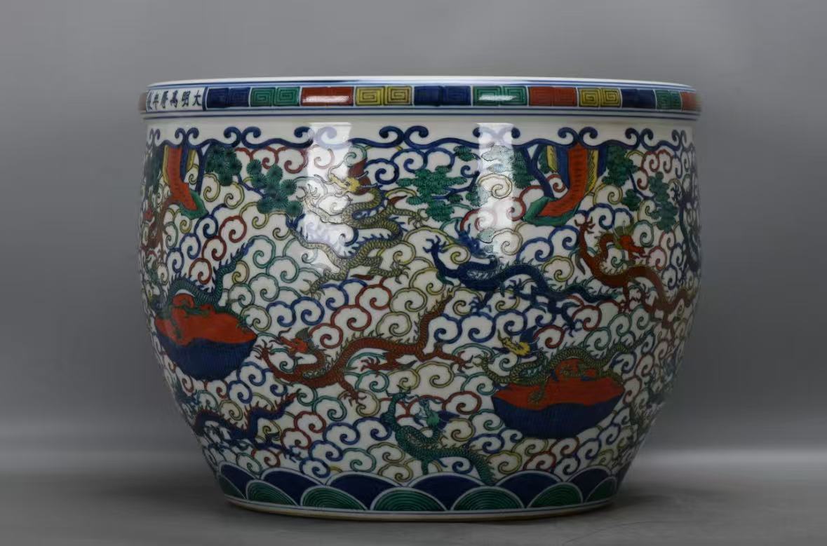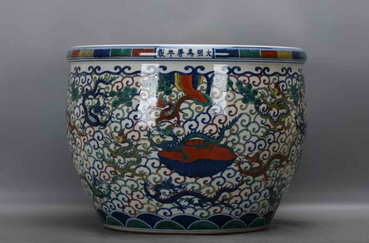 口径52厘米,器高44厘米,重约50斤。该器物为典型的大龙缸造型,以青花绘莲池游龙纹为主题,色彩丰富,纹饰繁复,展现了明代官窑青花瓷的典型特征。
