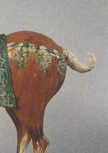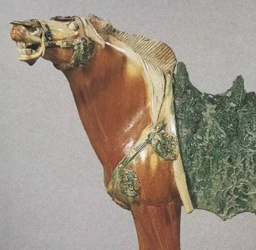 唐代三彩马俑。造型矫健,马头高昂,张嘴似在嘶鸣,神态生动。身披绿彩马鞯,上有精美花纹装饰,马身主体呈棕红色,腿部等部位有白、绿等色彩交融,展现了唐代三彩工艺的高超水准,体现当时马文化的盛行以及对马的喜爱与推崇。