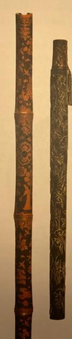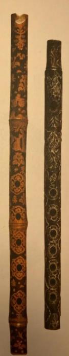 正仓院藏唐代雕石尺八(中仓藏品),以整块蛇纹岩雕琢而成,通长36厘米,管径2.1厘米,开七孔(六音孔一吹孔),孔距符合唐代十二律吕标准。笛身浮雕缠枝卷草纹,中段饰骑马狩猎场景,人物衣袂与奔马动态以线刻技法呈现;吹孔下方阴刻联珠翼马纹(粟特艺术典型母题)。经显微分析,笛身残留朱砂与金粉填彩痕迹,末端保留原始绀青染线,呼应《乐府杂录》"玉笛朱线"的宫廷仪制