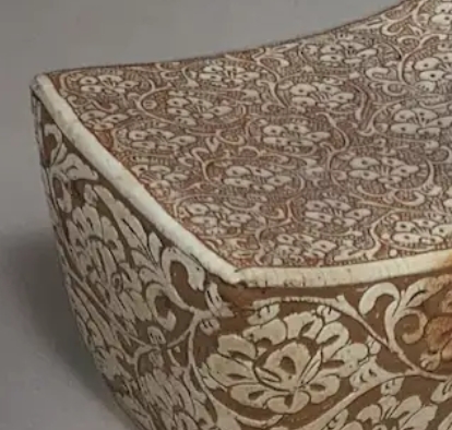 这是一件白地黑花花卉纹瓷枕,造型呈典型的长方体倭角样式,线条简洁利落。以白色瓷胎为底,运用黑彩进行装饰,枕面及四壁满布繁复精美的花卉纹,包括缠枝莲、宝相花等传统纹样。黑彩线条流畅自然,或勾勒花瓣轮廓,或描绘枝叶脉络,构图饱满且富有层次,白与黑的色彩对比鲜明,将花卉的柔美与生机展现得淋漓尽致,兼具实用的枕卧功能与艺术装饰价值。