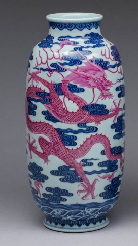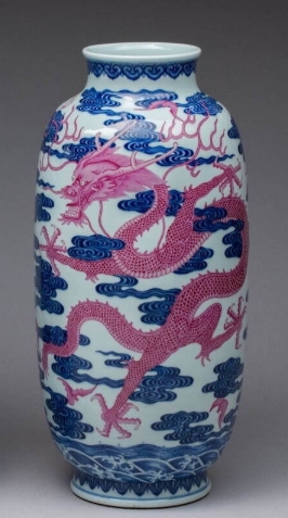 青花胭脂红龙凤纹瓶「大清乾隆年制」款