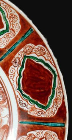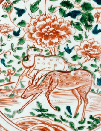 盘心绘有鹿、花卉、树木等图案,鹿寓意吉祥,可能象征福禄。盘边有分区装饰,以红彩为主色调,搭配绿彩等勾勒边框和纹饰, 属明清时期外销瓷风格,体现了当时中国瓷器工艺与海外审美需求的融合。