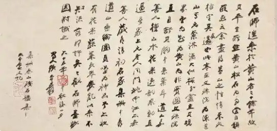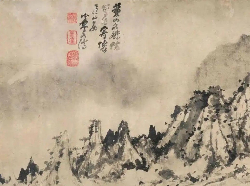 纸本水墨淡彩长卷(现存11开册页),单幅约25×20cm,总长约5米,山石以"解索皴"与"拖泥带水皴"交错,云海以留白配合淡墨晕染,开创"虚空生境"效果,题跋行草笔势狂放,钤"原济""石涛"朱白文印(与上海博物馆藏《细雨虬松图》印鉴一致)。