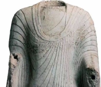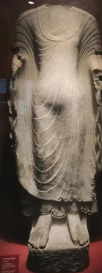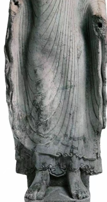 佛施无畏印与愿印,衣褶呈“褒衣博带演化式”,衣缘錾刻细密平行线;舟形背光外缘饰火焰纹,顶端置一小化佛;