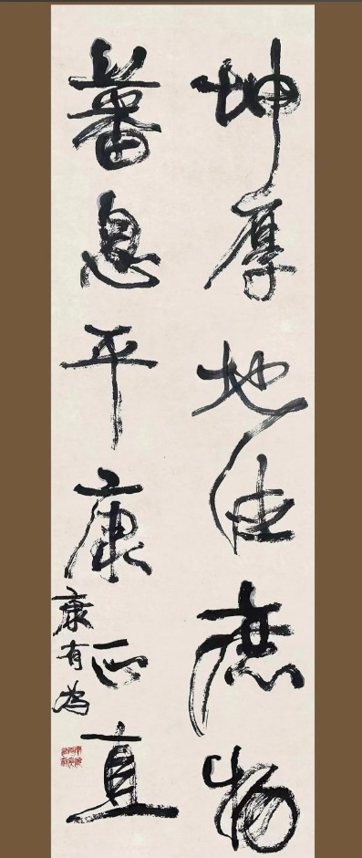 1920 年代康有为政治失意,转而以鬻书自给。其书法主张“碑学”,力倡雄强浑穆之风,借苏轼豪放词意抒写胸中块垒,象征近代中国知识分子在动荡时代的精神呐喊。该轴不仅体现康氏成熟期“康体”风貌,也成为赛努奇博物馆收藏中国近现代艺术的起点,见证了 20 世纪初中法文化交往的关键节点