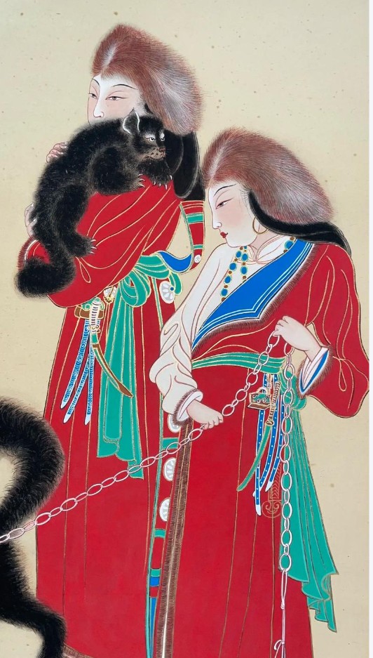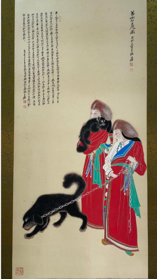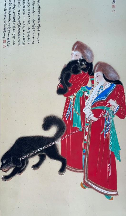 尺寸 108.6×73 cm,设色纸本立轴;画面两名藏装女子侧身牵一头西藏獒犬,犬链呈对角线,形成强烈动势;人物头戴金丝帽,长袍袒右肩,袖口、衣领镶毛皮,腰束彩带,衣纹线条兼工带写,设色浓丽,具敦煌壁画遗韵;左上角行书题“番女掣庞图,甲申嘉平,大千张爰”,钤“张爰之印”“大千”朱文印;右下角有张目寒题签。