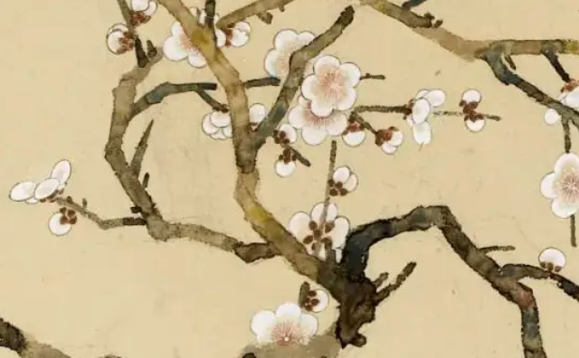 陈之佛,《梅花图》,1945年,纸本水墨设色。陈之佛所创作的《梅花图》(1945)呈现了画家在效法宋代花鸟画的同时,对日本琳派所推崇的“溜込法”——在底色未干之时,再敷上第二层色彩,使两种颜色相融——在描绘树干时的运用,深浅两色相撞,更显树干斑驳而粗糙的自然肌理。