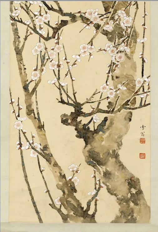 20世纪初期,中国传统绘画中清新雅致的花鸟画受到了欧洲和日本学者的青睐,赛努奇博物馆珍藏的陈之佛、张大千、谢稚柳等人的花鸟画,也展现了西方收藏视角下不同于以文人画占主流地位的中国绘画审美体系,其中 陈之佛所创作的《梅花图》(1945)呈现了画家在效法宋代花鸟画的同时,对日本琳派所推崇的“溜込法”——在底色未干之时,再敷上第二层色彩,使两种颜色相融——在描绘树干时的运用,深浅两色相撞,更显树干斑驳而粗糙的自然肌理。