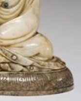 这是一尊 17 世纪的鸡血石雕刻观音菩萨坐像,观音呈结跏趺坐姿态,头戴精致发冠,面容慈祥宁静,身着长袍,衣纹流畅自然,巧妙展现衣物质感。胸前及衣饰处镶嵌有宝石,增添华丽感,底座亦有雕刻装饰,工艺精湛,整体造型体现当时观音造像的艺术风格与审美,具有较高艺术价值 。