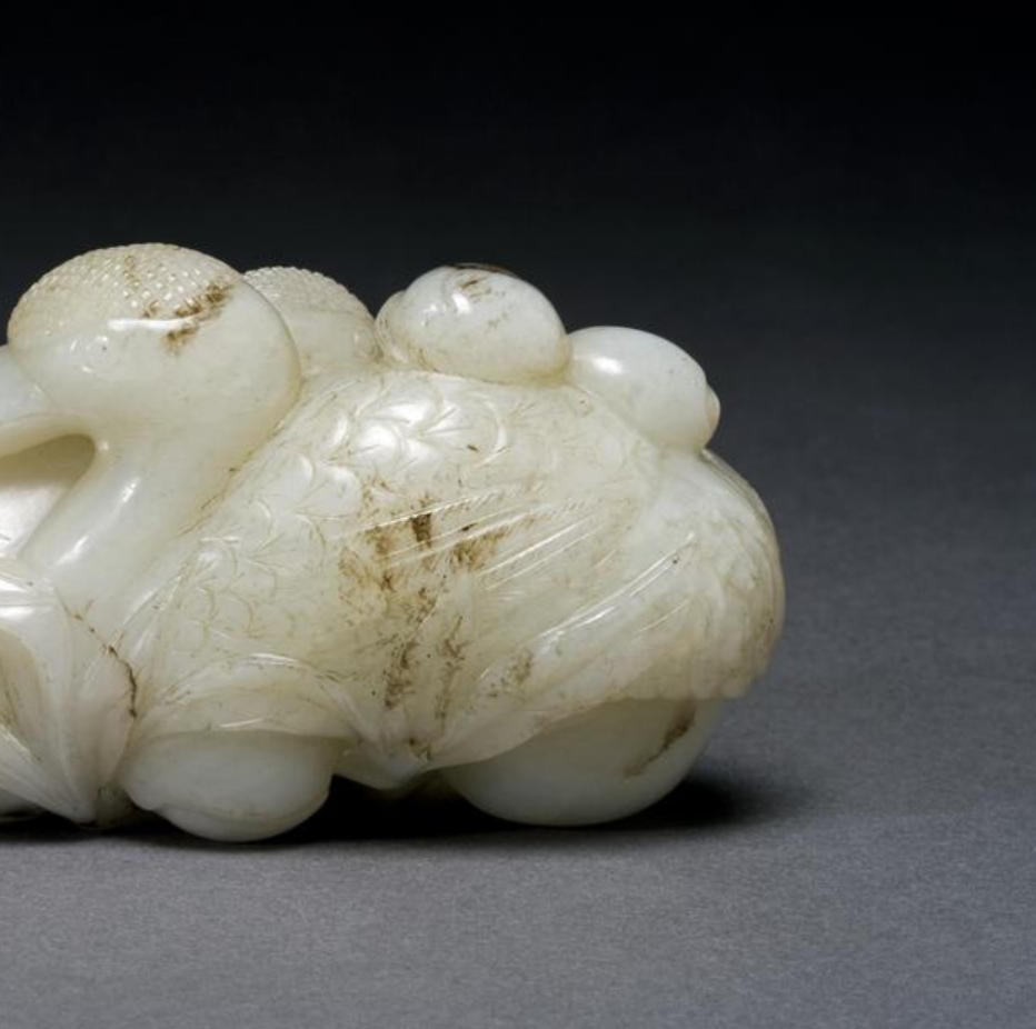 这件晚清和田玉摆件,玉质洁白温润,呈现出和田玉特有的光泽。雕刻主题为童子与鹅,造型生动。雕刻题材为鹅与寿桃等,鹅的羽毛、身形刻画细致, 寿桃圆润饱满,造型生动,体现了清代玉雕的工艺水准和吉祥的文化寓意,常蕴含健康长寿等美好祈愿。