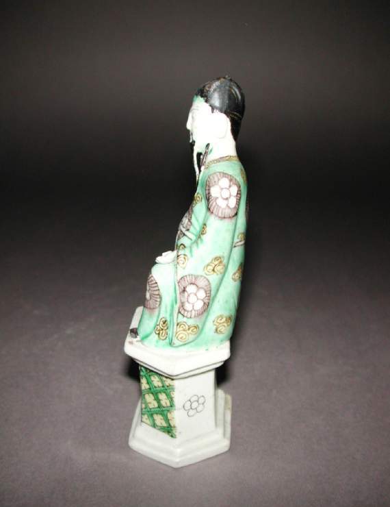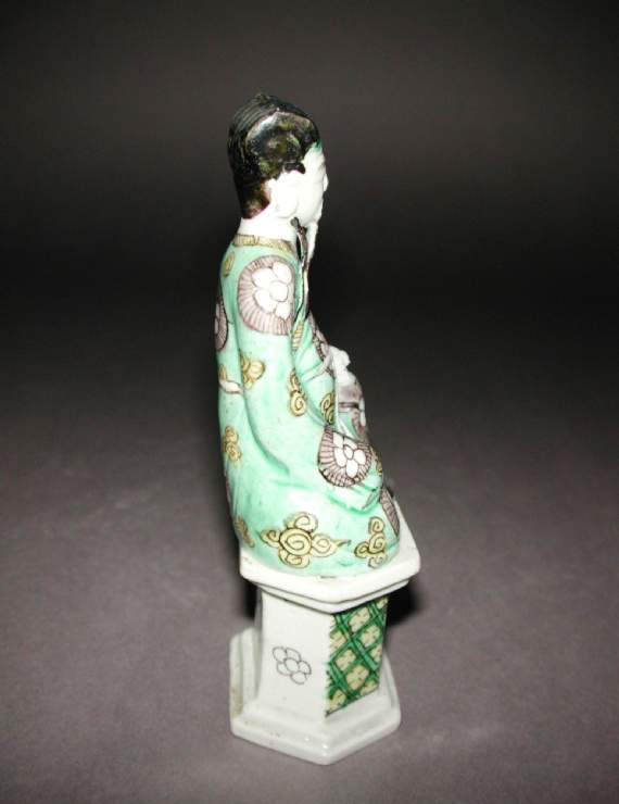 这是一尊清代瓷塑人物像,人物造型为传统中式长袍形象,头戴黑色帽饰,面容神态刻画细致,长须垂落,身着绿底、饰有花卉及云纹等图案的长袍,色彩搭配古朴。人物端坐于六边形底座之上,底座同样有绿、紫等色彩的花纹装饰,整体工艺体现清代瓷塑对人物形象塑造和色彩运用的特点,具有一定艺术与历史价值。
