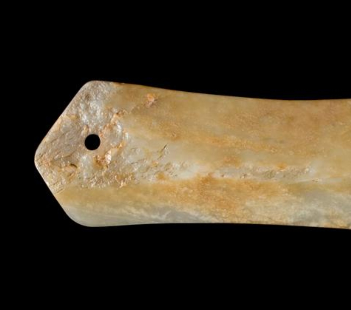 这是一件由软玉(透闪石)制成的刃状器物,呈浅棕色,带有一些深色区域。刃部略微展开,末端为不对称的弧形,一侧有弧形凸起的棱纹,背部则为扁平状。靠近尖端处从一侧钻有一个孔,该孔在后期经过重新雕刻。器物长 21.5 厘米,宽 7.4 厘米,整体造型简洁,体现了古代玉器加工的工艺特点。