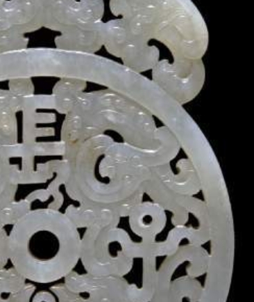 这是一件制作于 1736-1795 年(乾隆时期)的软玉饰品,呈淡绿白色,采用汉代玉璧风格雕琢,兼具透雕与刻纹工艺。顶部有四条龙,上方一对相对,下方一对相背;四个方向以镂空篆书刻 “长宜子孙” 四字,由顶部一对相对的凤凰和底部一对相对的龙分隔。边缘一侧刻 “乾隆年制”,另一侧以隶书刻 “良字第一百六十八号”。其直径 7.3 厘米,长 12.8 厘米。北京故宫博物院藏有三件设计几乎相同的较大玉璧,此件的编号 “168” 和 “良” 字均与《千字文》顺序匹配,证明其曾为乾隆收藏品。