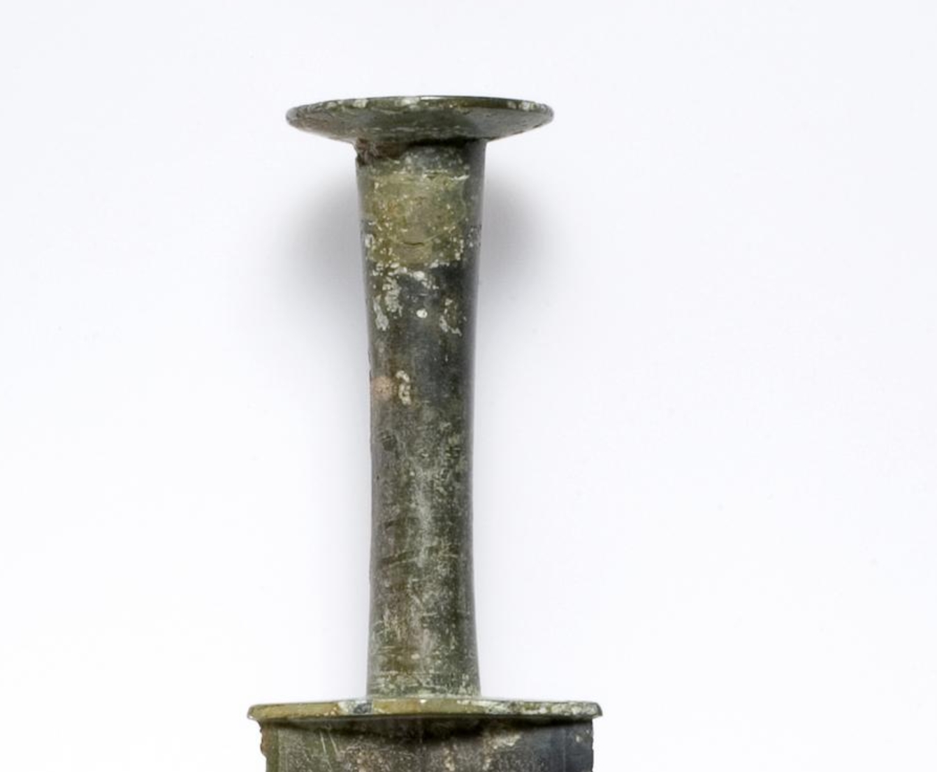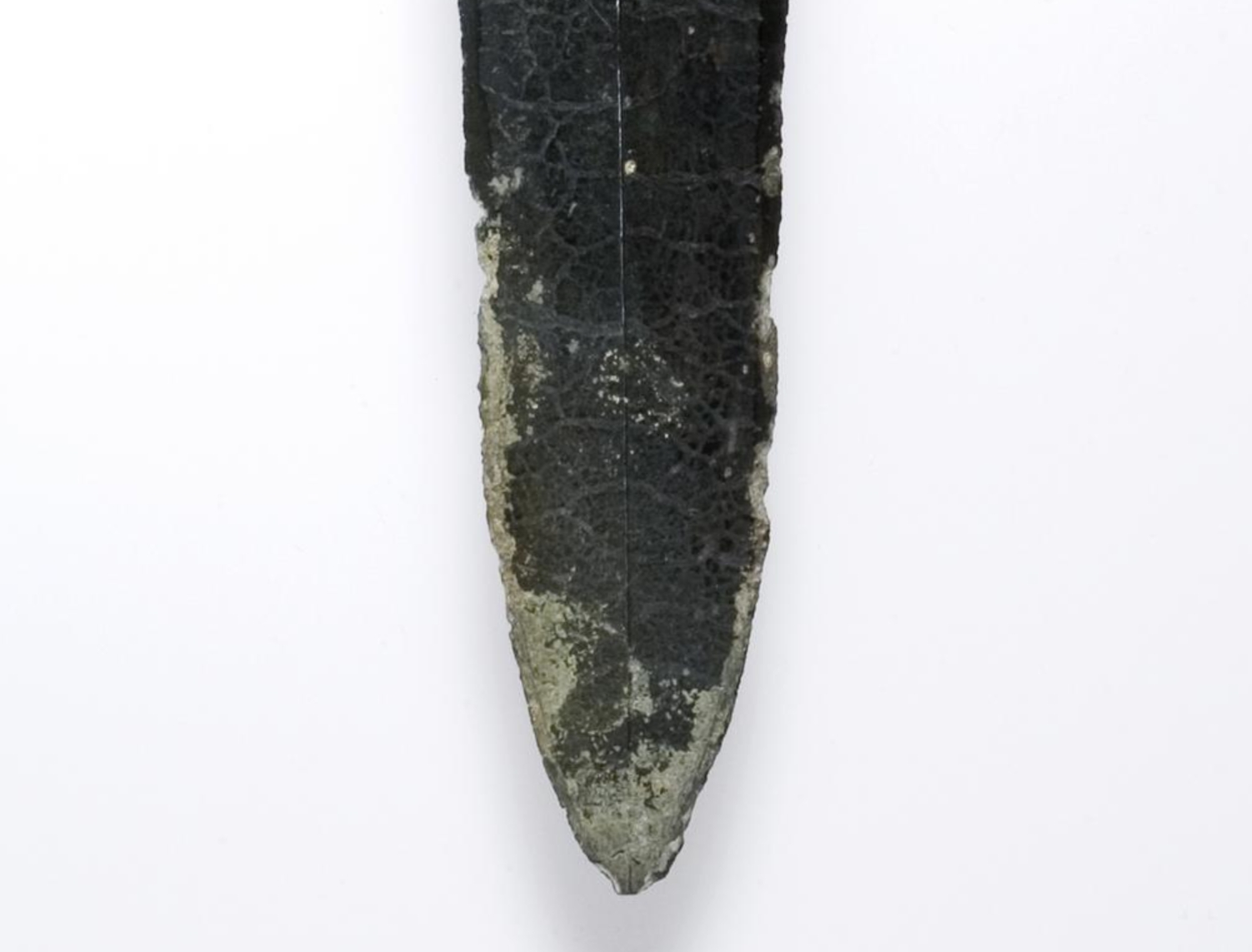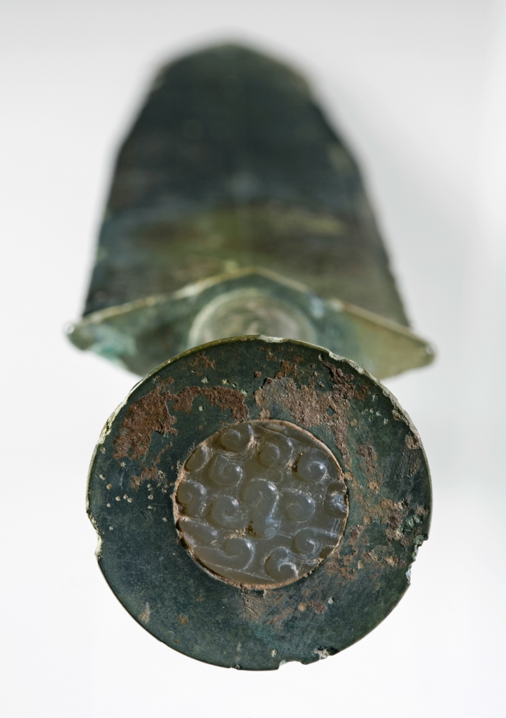 这是一件青铜剑,属于兵器类,剑身呈双刃、渐窄形态,表面呈黑绿色。剑柄末端装有小型玉质剑首( pommel),采用嵌接工艺将玉与青铜结合,玉质为软玉(透闪石)。剑首直径 1.9 厘米,整体展现了青铜铸造与玉石镶嵌结合的工艺特点,相关信息收录于《不朽的石头 —— 从新石器时代到 20 世纪的中国玉器》第 45 页。