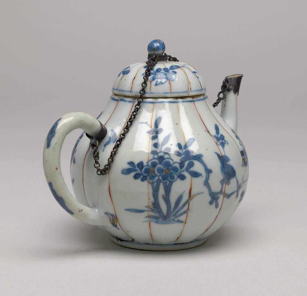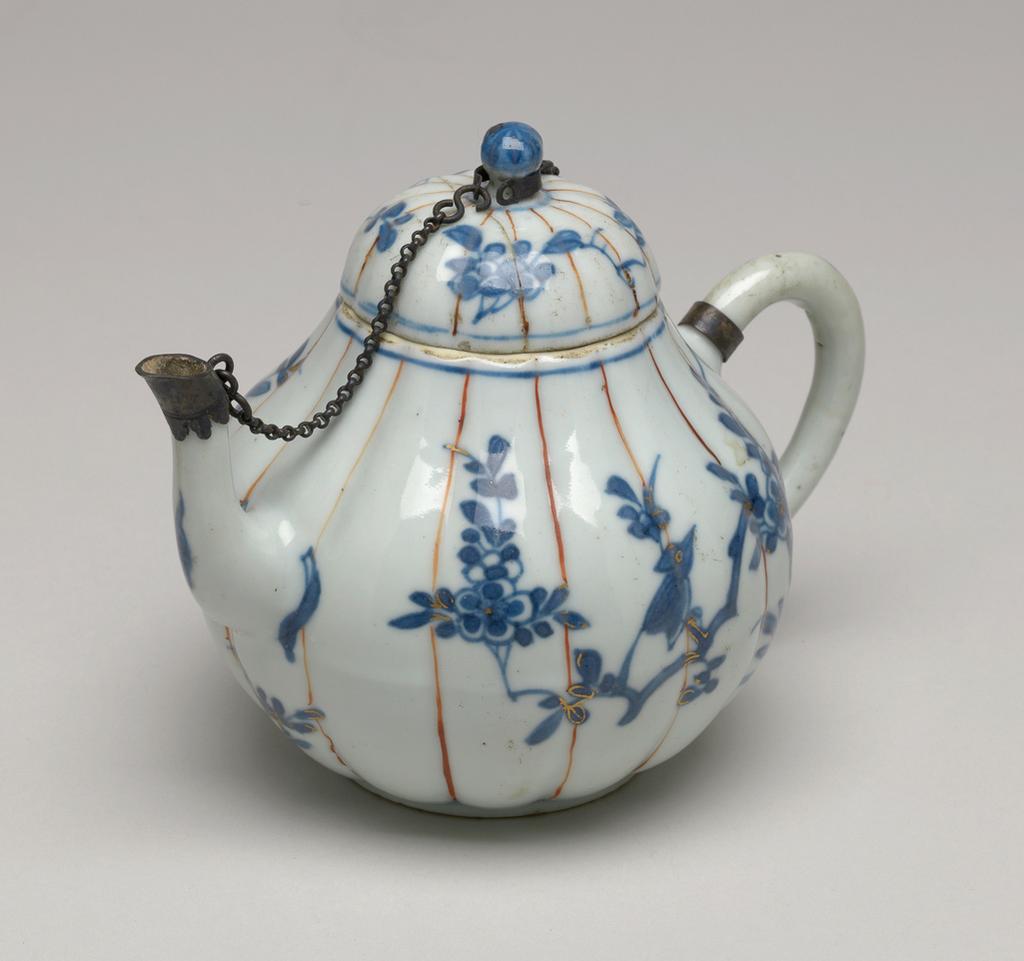 这把执壶以白瓷为胎体,主体施白釉,壶身绘有蓝白相间的青花图案,描绘了花卉与禽鸟,青花发色沉稳,图案线条流畅,富有层次感 。壶身呈上窄下宽的梨形,腹部圆润饱满。壶嘴弯曲细长,与壶身衔接自然,壶柄则为弧形,便于握持。壶盖上有一颗蓝色圆珠形钮,以金属链条与壶身相连,防止壶盖脱落 ,整体造型精巧雅致,兼具实用性与观赏性。