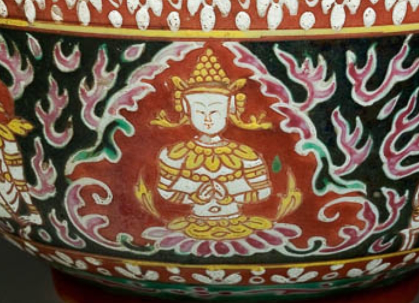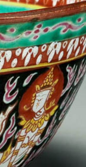 这只瓷碗敞口,碗壁斜收,圈足。碗内外壁绘有丰富的彩色纹饰,内壁口沿处是一圈多彩的几何形连续图案,内壁中部是绿色的底色 。外壁装饰尤为精美,以红、绿、黄、黑等色彩绘制佛像、花卉、卷草等图案,佛像神态安详,花卉舒展,卷草纹线条流畅 ,整体色彩对比鲜明,纹饰繁复细腻,彰显出高超的彩绘工艺。