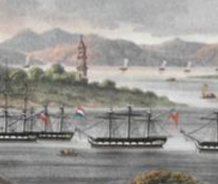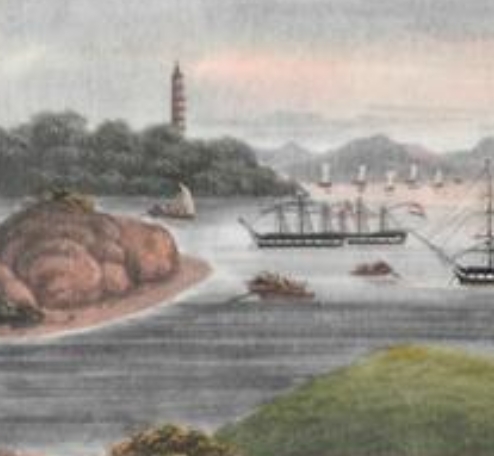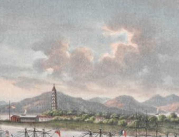 这幅画创作于 19 世纪(约 1840-1870 年),属于中国外销艺术范畴,体现了当时中国外销水彩画的风格特点。黄埔是清代重要的外贸港口,外国船只在此锚泊装卸货物,需通过舢板等小船往返广州,这幅画记录了当时的港口景象,对研究 19 世纪中外贸易及港口历史具有参考价值。