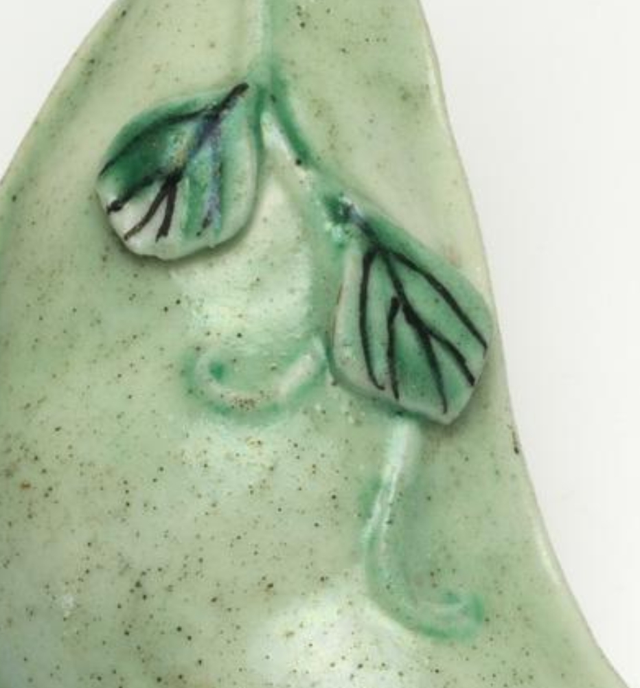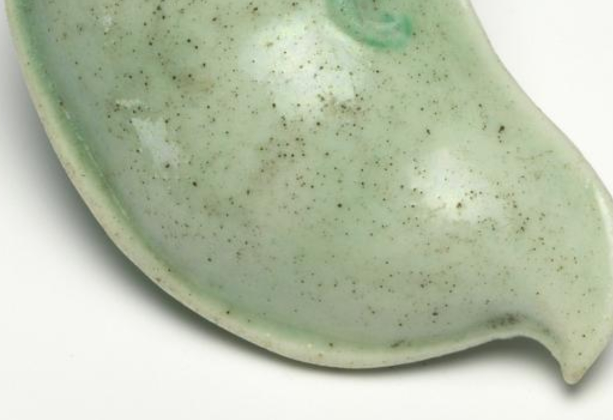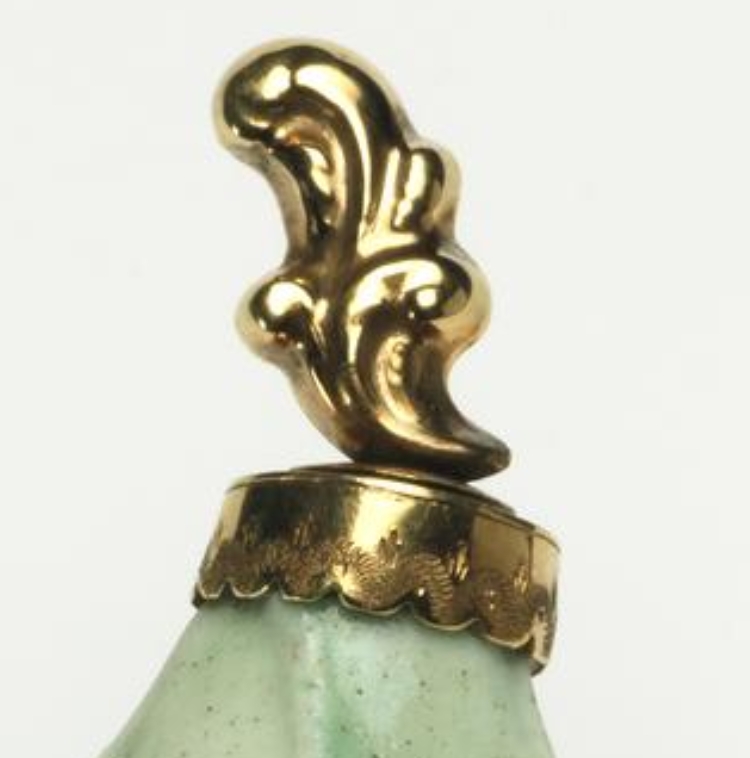 这是一件瓷质鼻烟壶,采用模制工艺塑造成豆荚形状,表面以浮雕手法呈现叶子纹饰,并施以绿釉装饰,壶颈与壶塞为黄金材质。壶高 5.6 厘米,现陈列于菲茨威廉博物馆 28 号展厅(亚洲艺术展厅),归入奥斯卡・拉斐尔收藏(编号 159)。