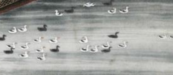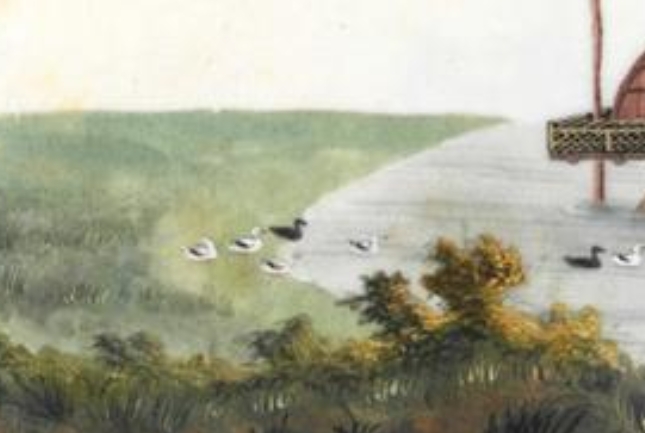 这幅画创作于 19 世纪(约 1840-1870 年),属于中国外销艺术范畴,体现了当时外销水彩画的风格。画中引用《番禺县志》记载,反映了珠江三角洲地区以鸭船养鸭为重要畜牧业的生计方式:每船可容 3200 只鸭,晨放岸觅食,深秋肥鸭运至广州售卖、留养产蛋或制成腊鸭,是研究 19 世纪岭南地区农业与民俗的形象资料。