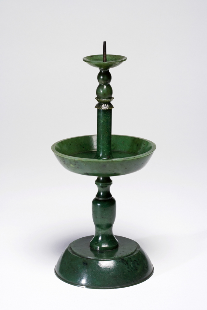 这是一套由碧玉制成的佛教五供,整体呈深绿色并带有黑色斑点,包含两件烛台、两件花瓶和一件香炉。其中,花瓶与香炉上雕刻有仿古玉纹饰,工艺精巧,纹饰古朴。整套器物搭配一个精心雕刻的木质底座,现陈列于菲茨威廉博物馆的亚洲艺术展厅(Gallery 28),是兼具实用性与艺术性的宗教祭祀器具。