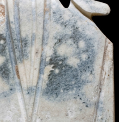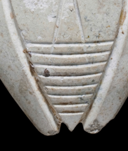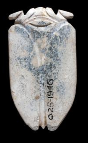 这件蝉形雕件以青玉为材质,整体呈灰绿色,表面有大面积蚀变痕迹,长 5.9 厘米、宽 3.3 厘米。器物正面精雕出头部、突出的眼睛及翅膀,线条简洁却勾勒清晰,背面则雕刻为肋状躯体,生动还原了蝉的形态特征。雕件附有相关标签记录,目前处于存储状态,虽历经岁月侵蚀,仍能看出古代工匠对蝉的形态把握与雕刻技法的娴熟,是一件兼具自然模仿与工艺美感的玉器。