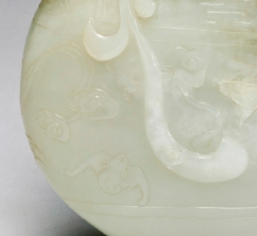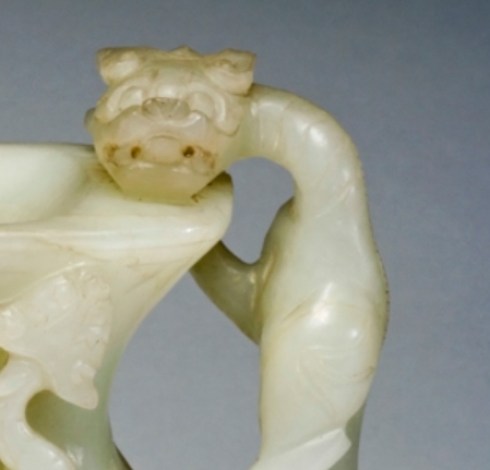 该执壶制作于 1800-1900 年(清代),以软玉(Nephrite)为材质,收录于《不朽之石 —— 中国玉器从新石器时代到二十世纪》(第 117 页)。清代玉器雕刻工艺精湛,常将吉祥纹样与实用器物结合,这件执壶的螭龙、蝙蝠、灵芝等纹饰,分别象征权势、福气与长寿,体现了当时玉器制作中 “图必有意,意必吉祥” 的文化特点,对研究清代玉器装饰题材与工艺风格有重要参考价值。
