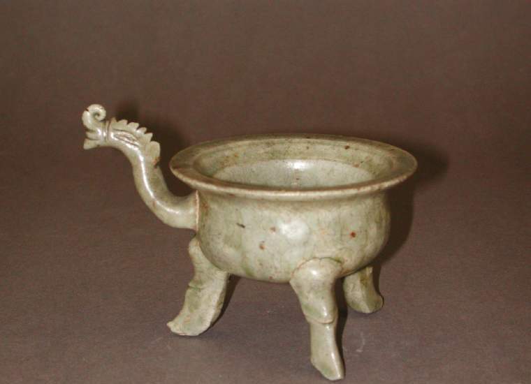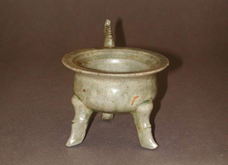 该香炉制作于六朝时期(220-589 年),属越窑青瓷典型器物,收录于《中国青瓷》一书。六朝是青瓷发展的重要阶段,越窑作为当时代表性窑口,以青釉瓷器闻名。这件香炉的龙形柄与三足设计,既具实用功能,又体现了当时的造型审美,对研究六朝青瓷工艺与熏香文化有参考价值。