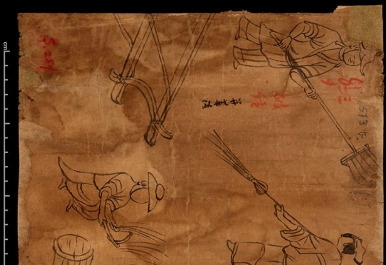 敦煌遗书现藏大英图书馆,正面书写佛经《金刚般若波罗蜜经》,背面即为白描稿部分,原卷上下宽24.7厘米,全长240.5厘米,黄麻纸。其中的白描稿部分是弥勒下生经变内容,具体性质是洞窟壁画底稿。