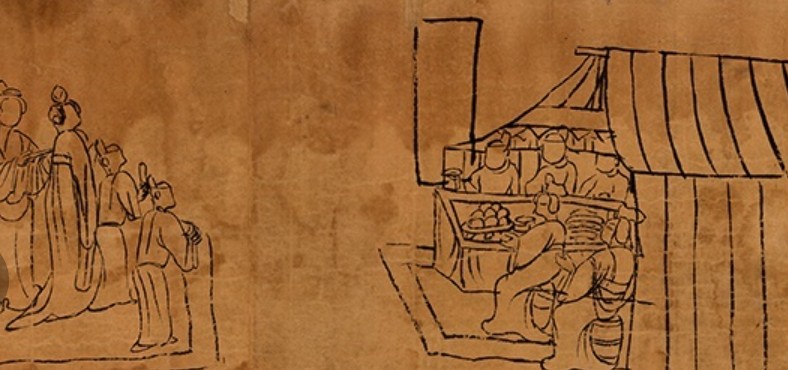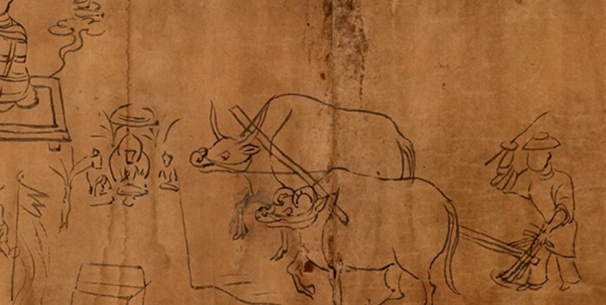 该白描画稿按写卷阅读顺序,从右至左分别画弥勒下生经变中的婚嫁图、牛耕图、说法、听法、路不拾遗、树上生衣、老人入墓、拜塔、收获图。