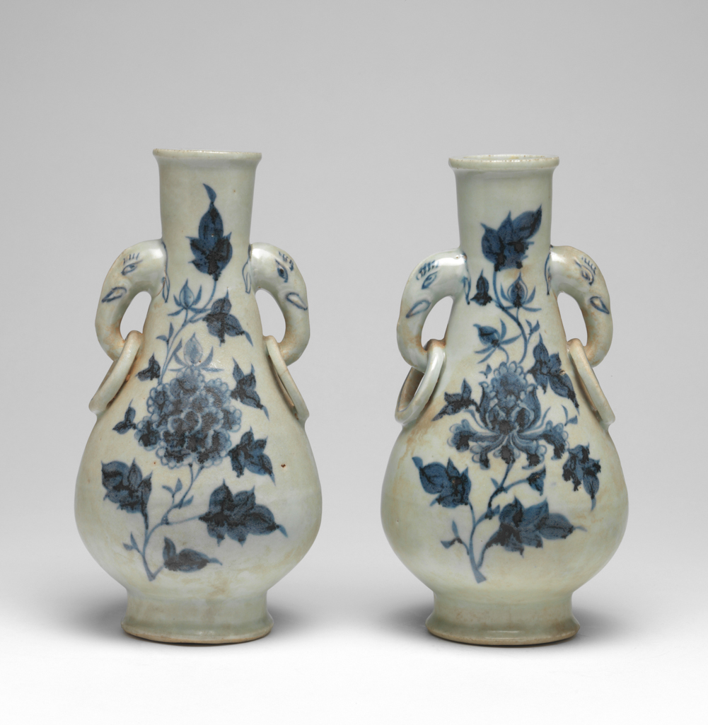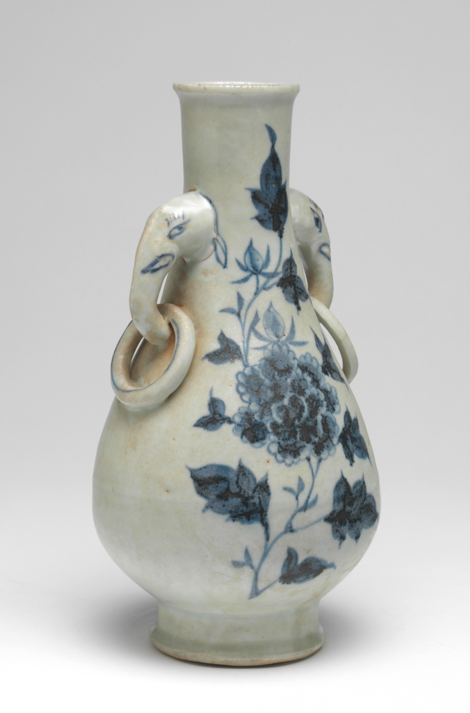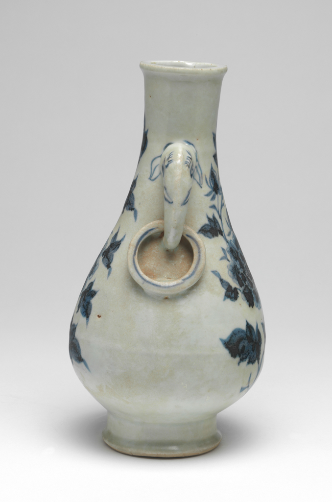 这是一件元代硬瓷青花瓶,为一对(另一件编号 C.689B-1991)中的一件,高 24.6 厘米,直径 12.7 厘米,现处于存储状态。瓶呈梨形,细颈,厚圆唇,两侧饰象首衔环耳,象首细节精致,绘有眼睛、睫毛、象牙和耳朵,衔环以单圈纹装饰。瓶身两侧绘有雅致的青花牡丹纹,腹部下收至外撇的高足,底部为深凹平底,内壁与底部无釉,底部有红色砂质沉积物。瓶身带有白色圆形锯齿标签(刻 “208”)和白色矩形标签(刻 “Russell”)。